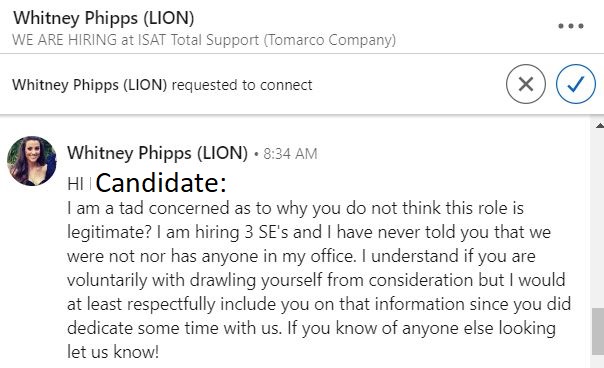 Folks, there is a reason the Candidate thought the position was not legitimate. The Candidate went through two interviews and was told ISAT had an excess amount of work. Then ISAT recruiter Whitney Phipps aka Nitwit-ney Fibs and the ISAT staff jerked that Candidate’s chain.
